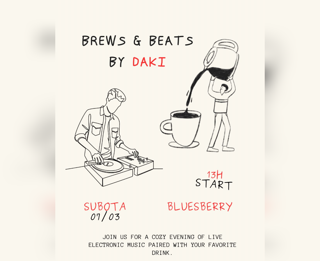 Dnevni događaj „Brews & Beat“ u Bluesberryju donosi opuštenu atmosferu uz kvalitetnu elektronsku muziku, druženje i dobar izbor pića. Ljubitelje house zvuka očekuje idealna prilika da vikend započnu u dobrom ritmu i uživaju u dnevnoj varijanti klupskog provoda.