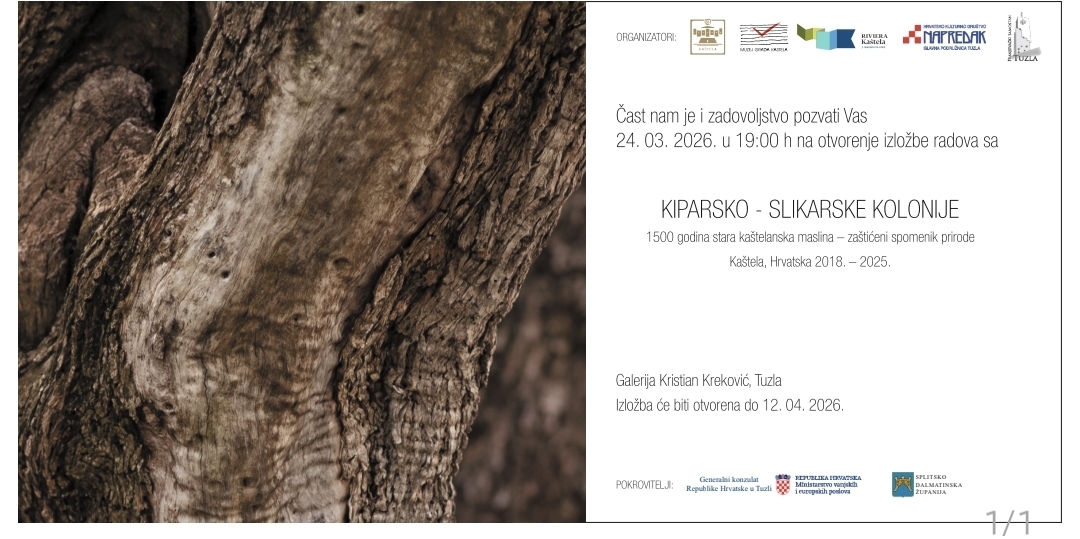 U Galeriji Kristian Kreković u Tuzli u utorak, 24. marta 2026. godine u 19 sati bit će otvorena izložba umjetničkih radova nastalih na kiparsko-slikarskoj koloniji „1500 godina stara kaštelanska maslina“.