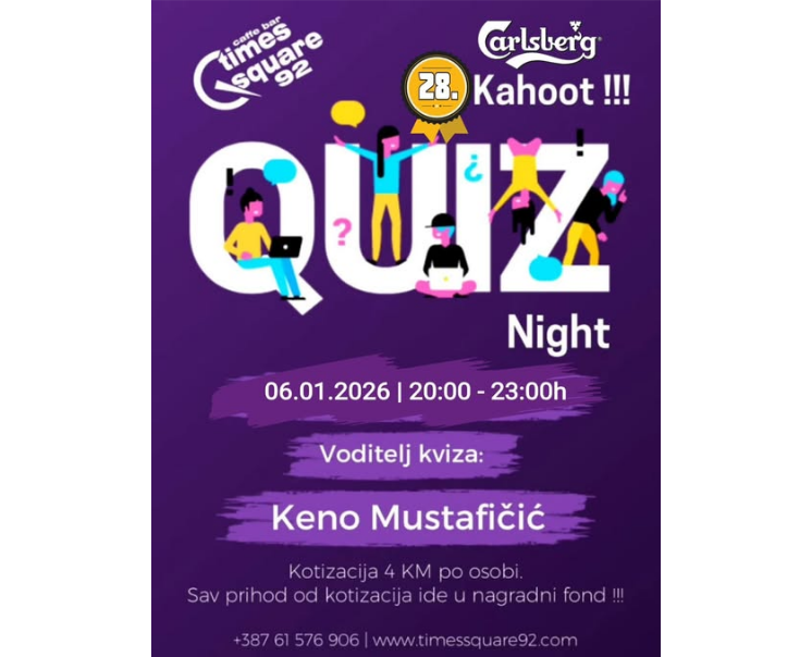 Svakog utorka u 20:00 sati, Times Square 92 Gračanica organizira Kahoot Quiz Night koji okuplja brojne ljubitelje intelektualnih izazova. Program se sastoji od tri ciklusa po 30 pitanja, ukupno 90 zanimljivih pitanja podijeljenih u pet različitih kategorija.