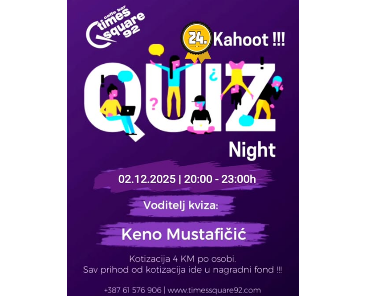 Svakog utorka u 20:00 sati, Times Square 92 Gračanica organizira Kahoot Quiz Night koji okuplja brojne ljubitelje intelektualnih izazova. Program se sastoji od tri ciklusa po 30 pitanja, ukupno 90 zanimljivih pitanja podijeljenih u pet različitih kategorija.