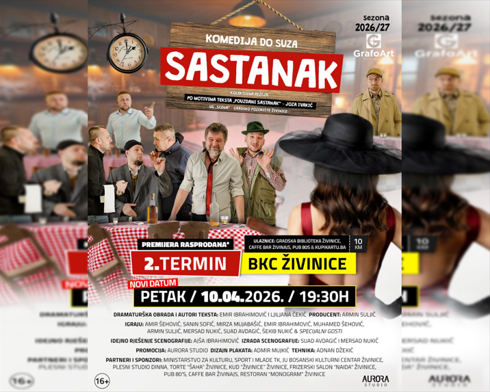 U Živinicama će 10. aprila u 19:30 sati, u JU Bosanski kulturni centar Živinice, biti izveden drugi termin hit komedije “Sastanak”, nakon rasprodane premijere koja je oduševila publiku.