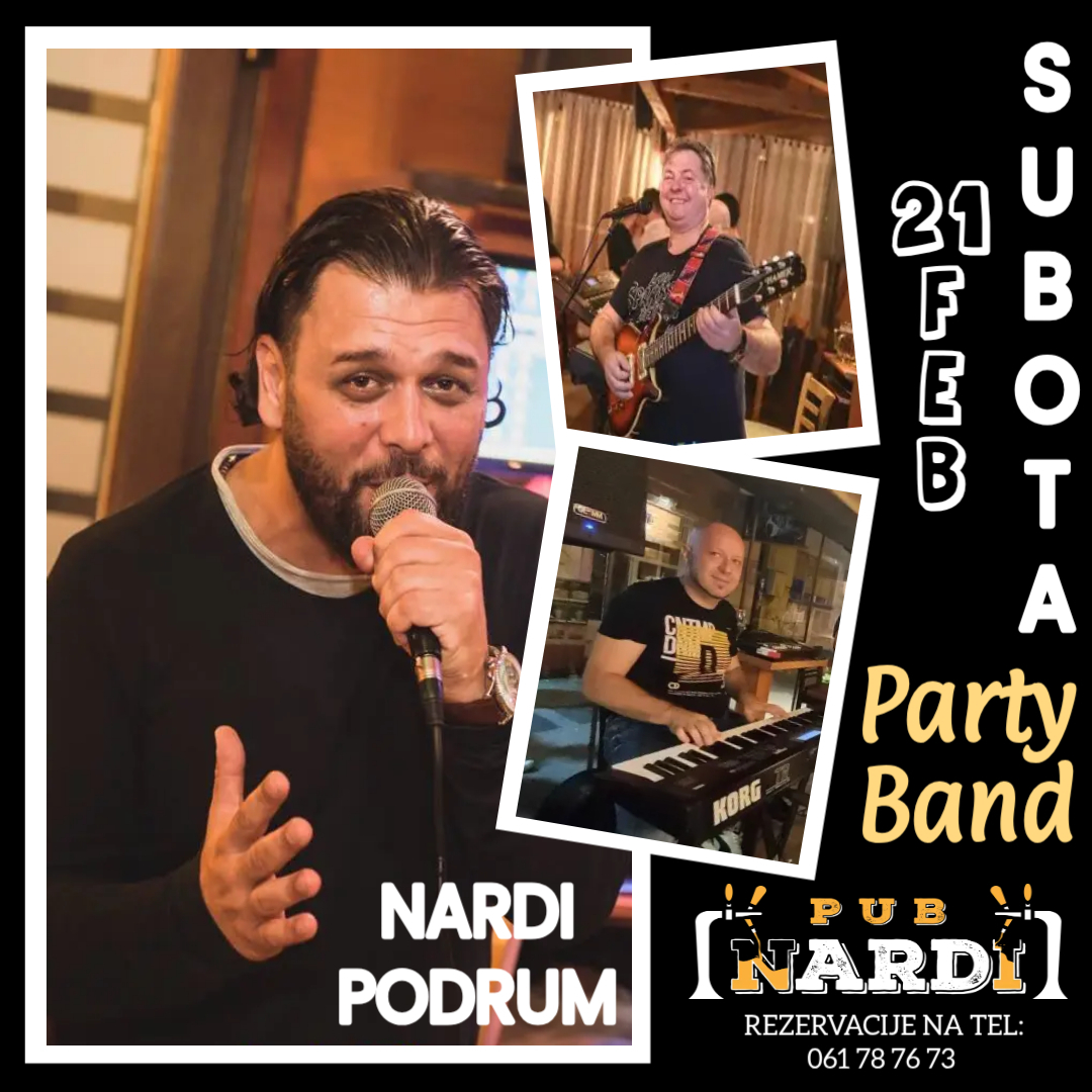 U subotu 21. februara, Nardi Pub postaje novo središte vikend atmosfere u gradu. Publiku očekuje energičan nastup Party Banda u sastavu Jasmin Joldić (Jolda), Oka i Davora – trojca poznatog po snažnoj interpretaciji najvećih domaćih i regionalnih hitova, te karakternom scenskom nastupu koji podiže raspoloženje od prvog do posljednjeg takta.